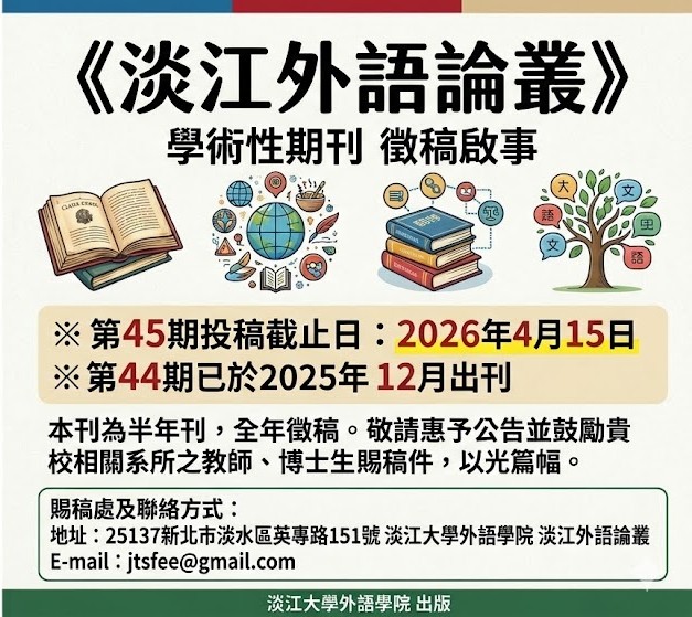 《淡江外語論叢》為學術性期刊,本刊為半年刊,全年徵稿。內容含外國文學、文化、翻譯、語言等,本刊第44期已於114年12月出刊。